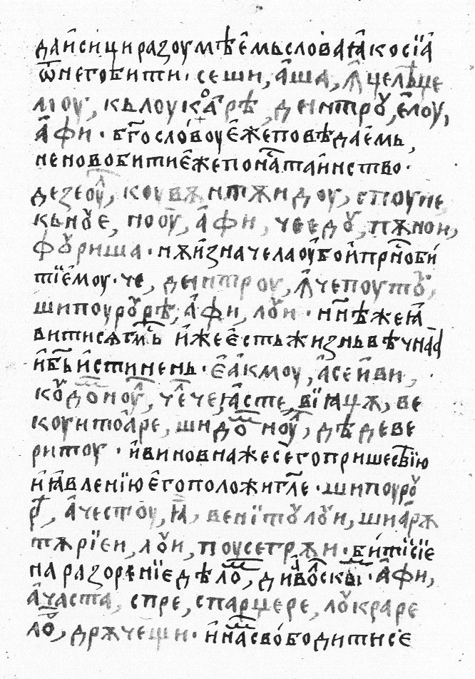 | | şi aşa să înţeleagem cuvîntul ca răsăritul razele strălucind întru el fiind. Zeulu cuvînt spuse nu de nou a fi, ce e după ale noastre furişe ce e întru început, amu, pururea e a fi lui. Ce acmu ivi-se Domnul cel ce iaste viaţă de veac şi Zeul deadevăr şi ce e vina acestuia venitului şi ivitului puse, grăi că vor fi acealea spre răsipirea lucrului drăcesc. | |