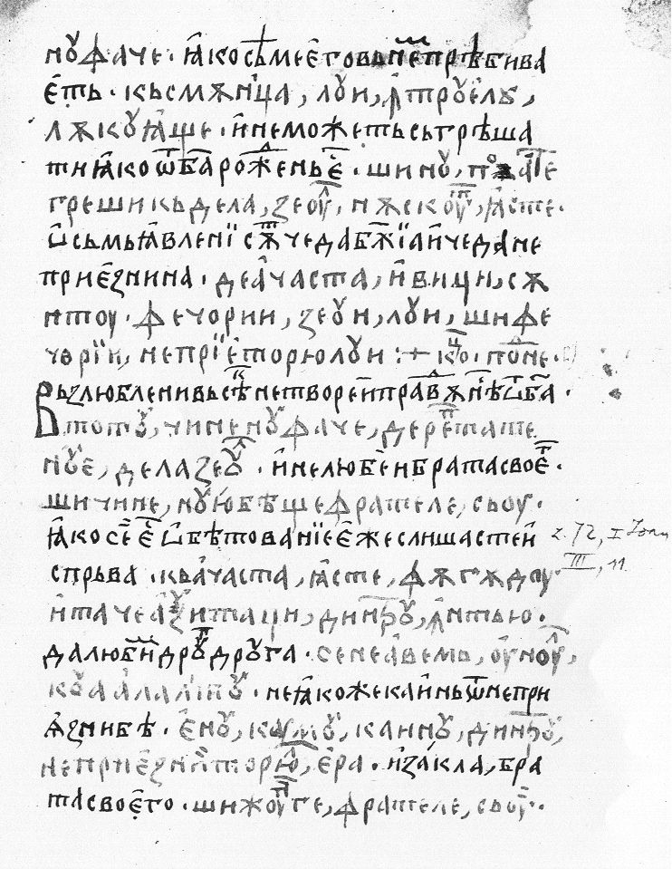 | nu face, că s[ă]mînţa lui întru elu lăcuiaşte şi nu poate greşi, că de la Zeul născut iaste. 10De aceasta iviţi sîntu feciorii Zeului şi feciorii Neprietoriului. ¤ Totu cine nu face dereptate nu e de la Zeul şi cine nu iubeaşte fratele său. 11Că aceasta iaste făgăduita ce auzit-aţi dintru întîiu, se ne avem unul cu alaltu, 12e nu cumu Cainu dintru Neprieznitoriul era şi junghè fratele său.