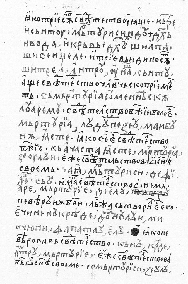 | Că trei sînt ce mărturisesc: Duhul şi apa şi sîngele, şi acei trei într-una sînt. E să mărturie omenească priimirem e mărturiia lu Dumnezeu mai mare iaste că aceaia iaste mărturiia lu Dumnezeu ce el mărturisi de Fiiul său. ... aibi mărturie de el. Necrezînd Zeului, mincinos iaste făcînd el că nu creade întru mărturia ce mărturisise Zeul