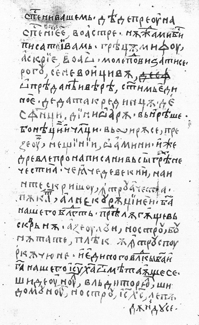 | | de împreunarea spăsenieei voastre, nevoe-mi fu a scrie voao rugîndu-vă să vă tămăduiţi de pridădirea credinţa Sfinţilor una. Afară ziseră, amu, alţii oameni cei ce după vechile Scripturi-s întru acealea păcate necuraţi, e a Dumnezeului nostru bunătate înainte alăturară întru spurcăciuni şi unul Vlăduitoriul Zeul şi Domnul nostru Isus Hristos di-nsul lepădară-se. | |