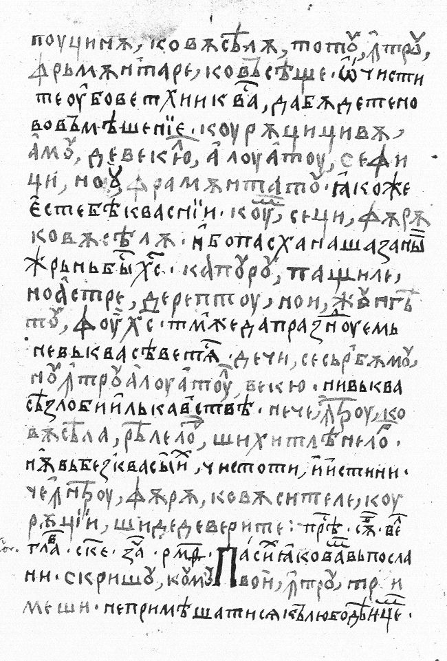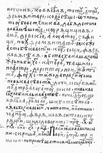 | [Epistola 1 către corintieni] V, 6 ...puţină covăseală totu întru frămîntare covăseaşte? 7Curăţiţi-vă, amu, de vechiul aluatu, se fiţi nou-framîntatu, cum seţi fără covăseală, capuru Paştile noastre dereptu noi jungheatu fu Hristos! 8Deci, se sărbămu nu întru aluatul vechiu, nece întru covăseala realelor şi hitleanelor, ce întru fără-covăsitele curăţii şi deadeverite. ¤ 9Scrişu cumu voi întru trimeşi