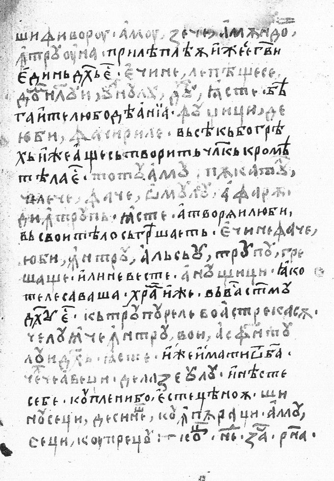 | Şi fi-voru, amu, zece, amîndoi întru una. 17E cine lepeaşte-se Domnului, unulu duh iaste. 18Fugiţi de iubi-facirile! Totu, amu, păcatul cela ce face omulu afară din trup iaste, e cine face iubi întru al său trupu greşaşte. 19A[u] nu ştiţi că trupurele voastre casă celuia ce întru voi a Sfîntului Duh iaste, cel ce aveţi de la Zeulu şi nu seţi de sineş. 20Cumpăraţi amu seţi cu preţu. ¤