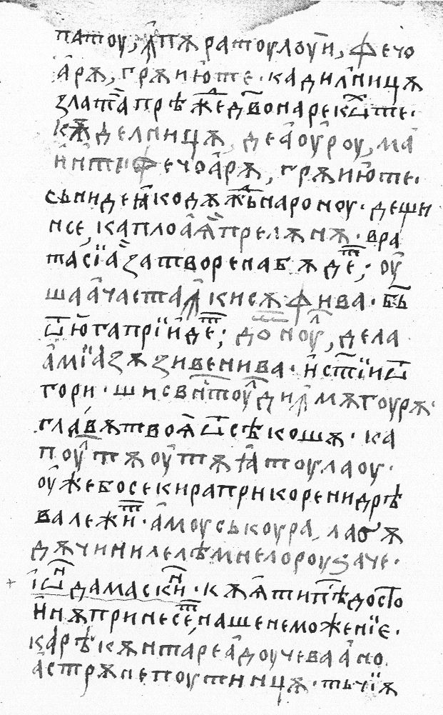 | | patu împăratului, fecioară grăiiu-te, cădelniţă de auru, mainte fecioară, grăiiu-te, deştinse ca ploaia pre lînă, uşa aceasta închisă fi-va, Domnul de la Amiazăzi veni-va şi svîntul din măgură, capul tău tăiatu-l-au, amu, săcura la rrădăcinile leamneloru dzace... Carea cîntare aduce-va a noastră neputinţă | |