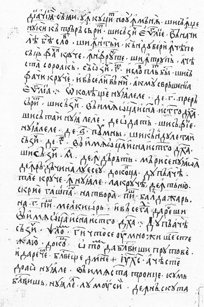 | | Di aciia să iai un cuţit nou în mînă şi să îngenuchi cătră Răsărit şi să zici Evanghelie: ... . Şi întîi cîndu veri înceape să-ţi faci cruce în frunte şi în trup aceasta soroacă să o zici 3 ... şi să faci cruce... . Acmu svîrşenia Evanghelia. Ocoleaşte nuialele de 3 pre Răsărit şi să zici: ... şi să tai nuialele deodată şi să fie nuialele de 6 pumni. Şi cîndu le tai să zici de 3: ... şi să zici molitva dendărăt: „Mări-se nuiaoa den rădăcina lu Eseu... . După acea tae cruce în nuiale; la crucea dentîniu scrie Gaşpar... Baldajar... Melchior. După acea să zici ps[a]lom: ... „Blagosloveşte, Doamne, Isus Hristos, aceaste doao nuiale... cum blagoslovişi nuialele lu Moisi den născuta | |