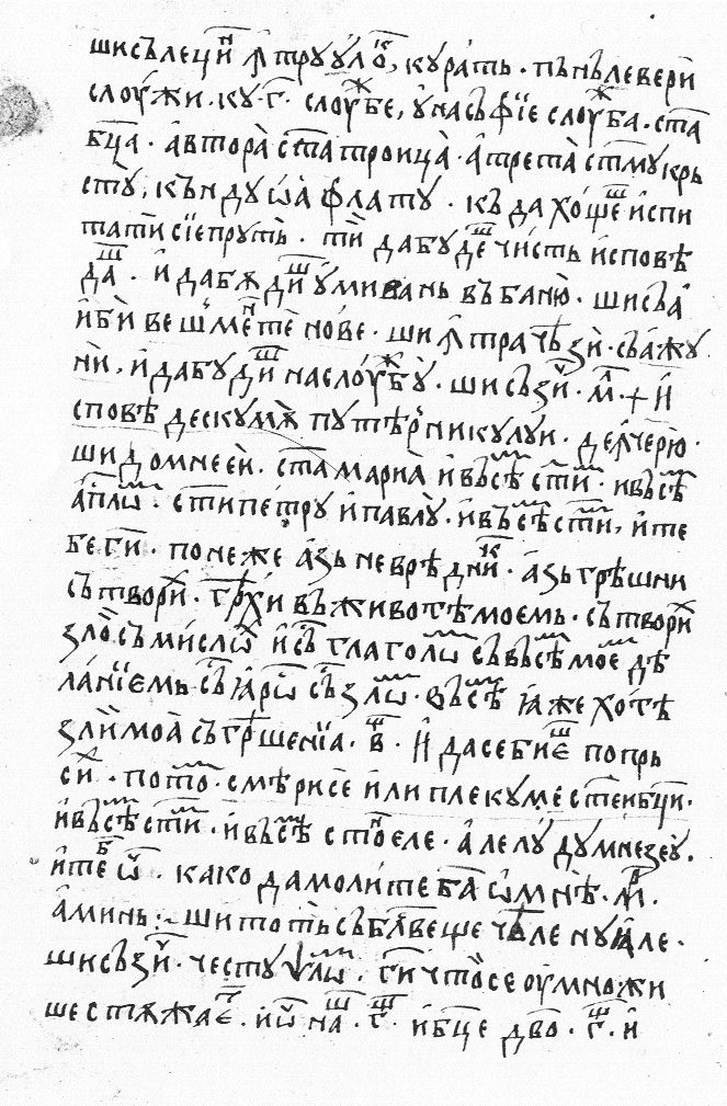| | şi să le ţini întru u[n] loc curat pînă le veri sluji cu 3 slujbe: una să fie slujba... . Cîndu o aflatu... şi să aibi veşmente nove şi într-acea zi să ajuni... şi să zici molitva: „Ispovedescu-mă putearnicului den ceriu şi Doamneei, Sfînta Maria, ... plecu-me Sfintei... sfintele ale lu Dumnezeu.... Amin”. Şi tot să blagosloveşte ceale nuiale şi să zici cestu ps[a]lom: ... | |