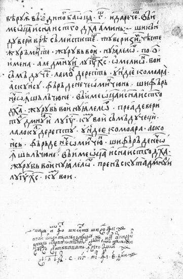 | | 184 În josul paginii se află o notă care nu a fost complet descifrată. Conţinutul ei ar putea fi: „Care am fost şi sintu şi voi fi, acea-i iscălitura lui D[u]mnăzău. Naş az Gavril Diiac, sin Popa Isac, (...) vî dni Ion Nieculai voevod, vecinic pamiat. În veci. Amin. Vî leat 7213, meseţ. fev, 5 dni”. | |