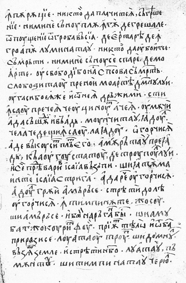 împărăţiia. Nimea să nu plîngă de păcatele sale astăzi, că ertarea den groapă se-au luminat; nime să nu se tiamă de moarte, că ne-au mîntuitu mîntuitoriul de moarte. Stinse ce era ţirut de dinsu, munci Iadul cela ce au pogoritu în Iadu, amări-se că îmbucă de trupul lu[i]. Şi adecă aşteaptă în Galelei de strigă, şi Iadul se amări-se şi căzu giosu, amărî-se şi se deşertă, amări-se şi fu batjocură, şi trupul lui se ti[m]pină cu Dumnezeu, luo pămîntu şi tîmpiră c[er]iu | |